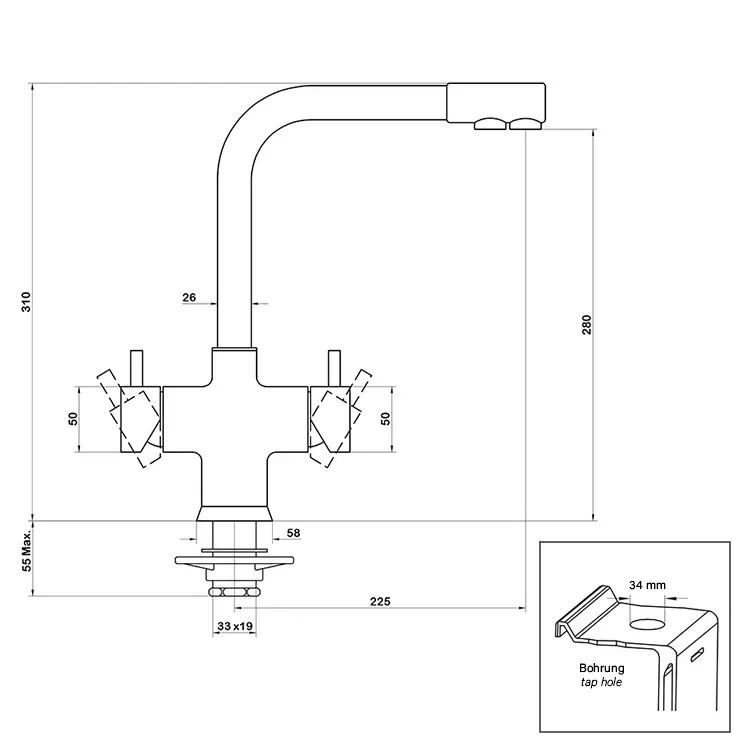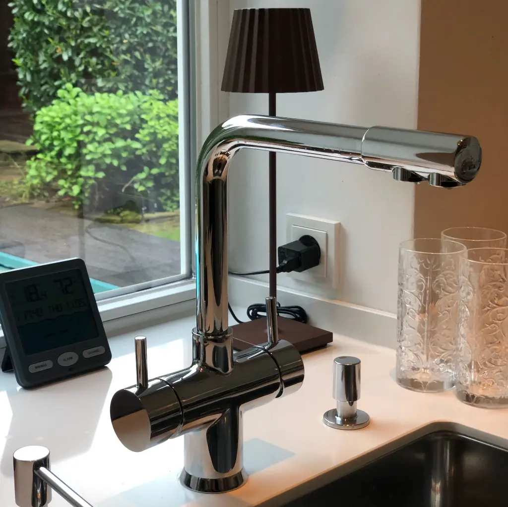 Die NOBIUS 5-Wege-Armatur vereint klassisches Warm- und Kaltwasser mit stillen, gekühlten und sprudelnden Trinkwasseroptionen in einer hochwertigen Küchenarmatur. Gefertigt aus verchromtem Messing und hergestellt in Italien, überzeugt diese Variante mit festem L-Auslauf und einer reduzierten Auslaufhöhe von 26 cm – ideal für Küchen mit geringerer Aufbauhöhe oder Oberschränken.