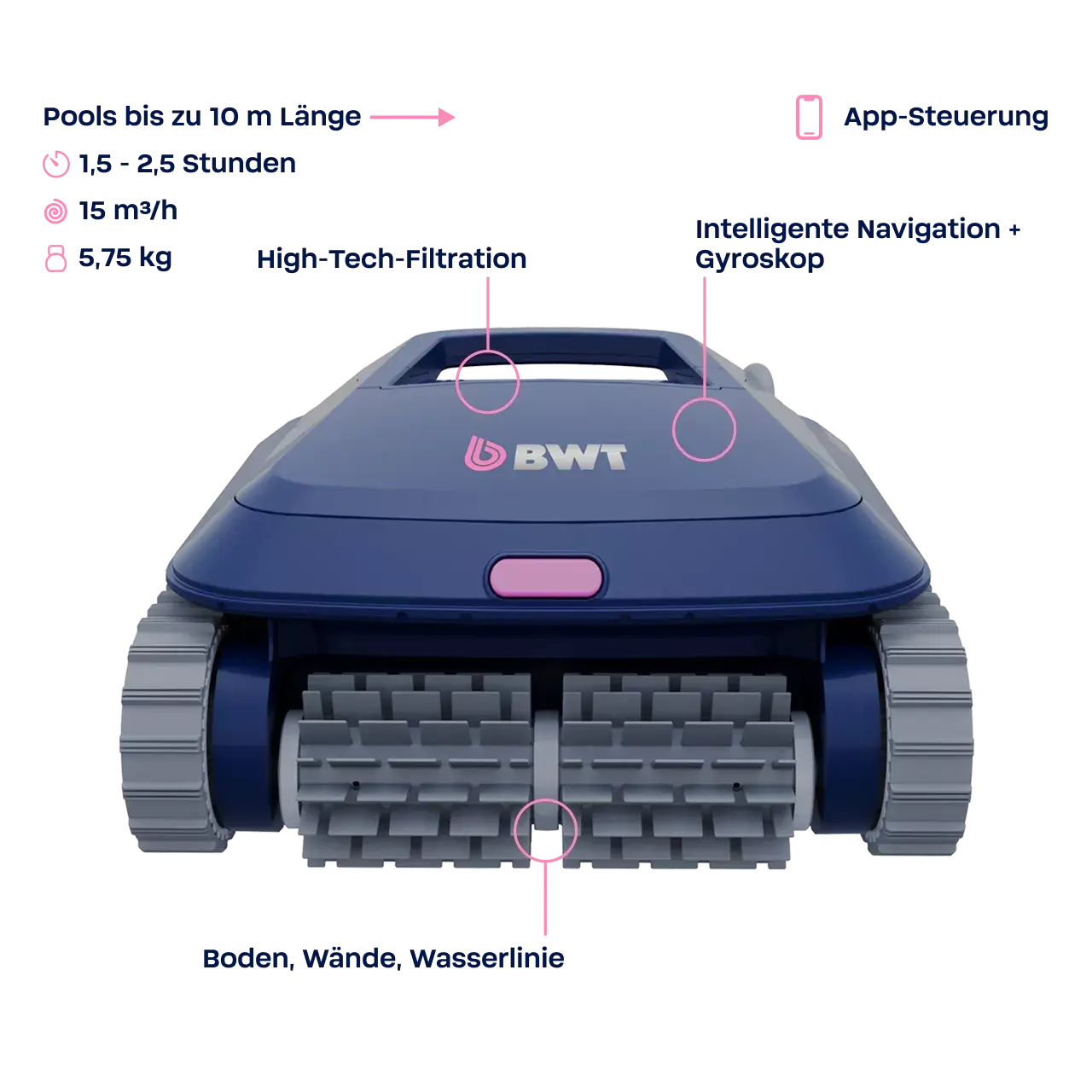 Trotz seines geringen Gewichts von 5,75 kg reinigt er Boden, Wände und Wasserlinie mit einer Saugleistung von 15 m³/h. Der Reinigungszyklus beträgt 1,5 h / 2,0 h / 2,5 h, unterstützt durch PVC-Bürsten, eine doppelte Hyperfine-Filtration und eine Leistungsaufnahme von 150 Watt. - SMART & ZUVERLÄSSIG