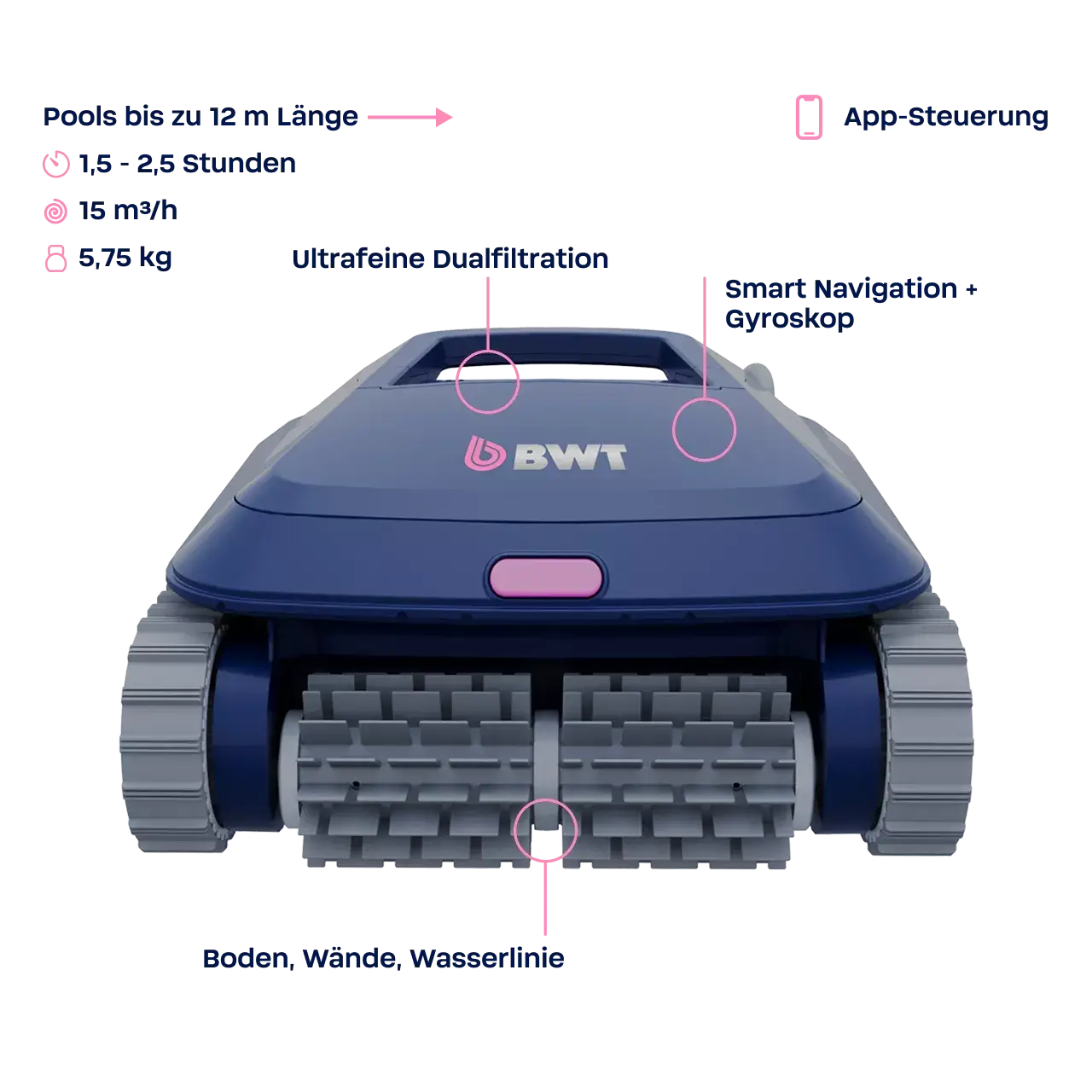 Trotz seines geringen Gewichts von 5,75 kg reinigt er Boden, Wände und Wasserlinie mit einer Saugleistung von 15 m³/h. Der Reinigungszyklus beträgt 1,5 h / 2,0 h / 2,5 h, unterstützt durch PVC-Bürsten, eine doppelte Hyperfine-Filtration, und eine Leistungsaufnahme von 150 Watt. - SMART & ZUVERLÄSSIG